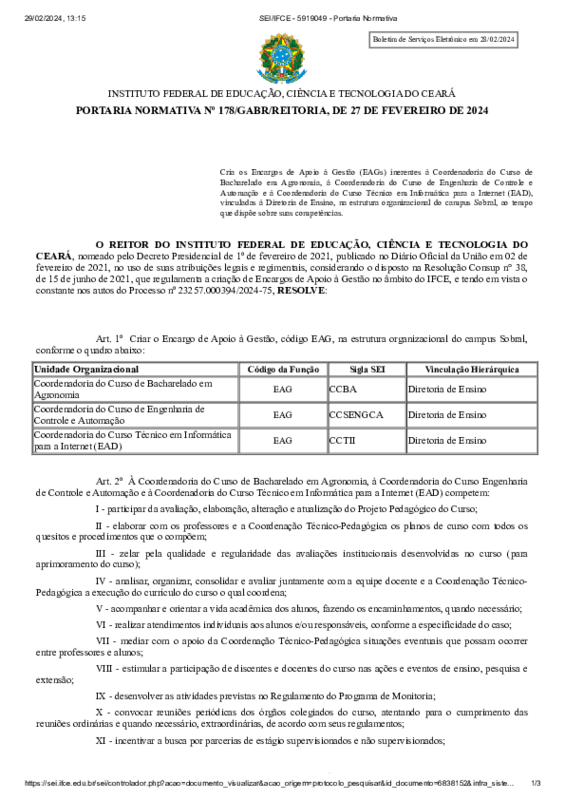 AbertaPORTARIA NORMATIVA Nº 178/GABR/REITORIA, DE 27 DE FEVEREIRO DE 2024