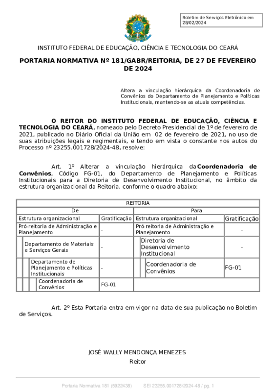 AbertaPORTARIA NORMATIVA Nº 181/GABR/REITORIA, DE 27 DE FEVEREIRO DE 2024