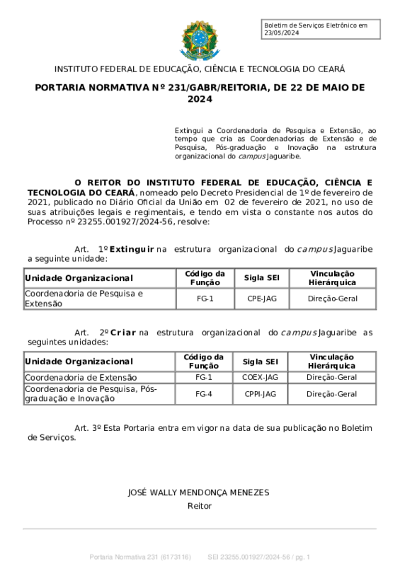 AbertaPORTARIA NORMATIVA Nº 231/GABR/REITORIA, DE 22 DE MAIO DE 2024