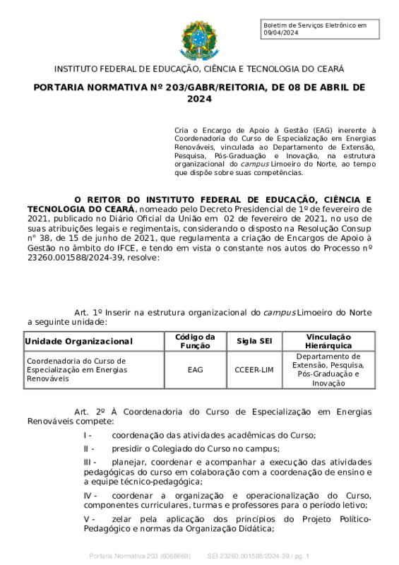AbertaPORTARIA NORMATIVA Nº 203/GABR/REITORIA, DE 08 DE ABRIL DE 2024