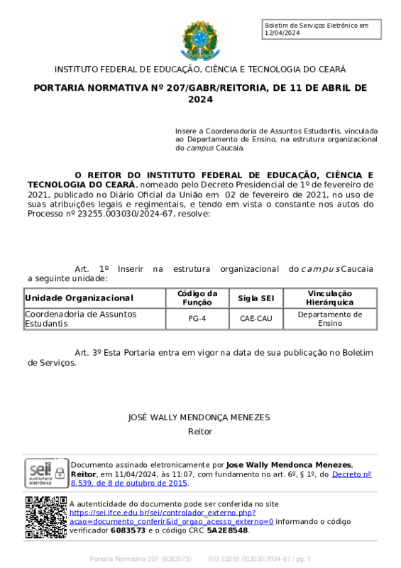 AbertaPORTARIA NORMATIVA Nº 207/GABR/REITORIA, DE 11 DE ABRIL DE 2024