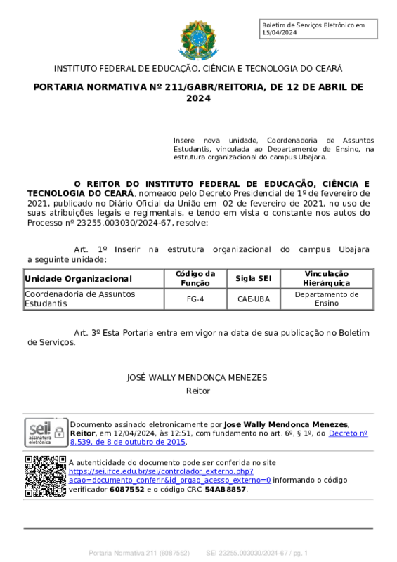 AbertaPORTARIA NORMATIVA Nº 211/GABR/REITORIA, DE 12 DE ABRIL DE 2024