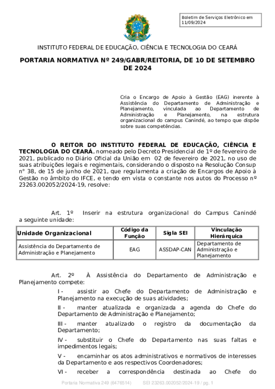 AbertaPortaria Normativa Nº 249/GABR/REITORIA, DE 10 DE setembro DE 2024