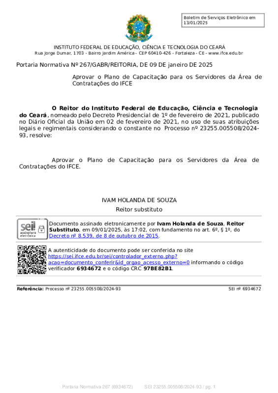 Aprovado por meio da Portaria Normativa Nº 267/GABR/REITORIA, de 09 de janeiro de 2025.