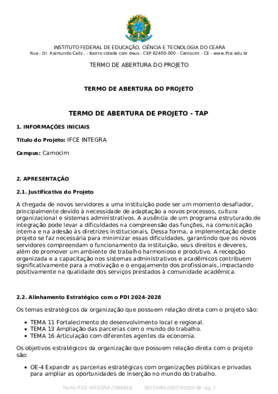 A integração de novos servidores é um processo essencial para que os profissionais se sintam acolhidos, compreendam a cultura organizacional e possam desempenhar suas funções de maneira eficiente. Este projeto visa proporcionar uma recepção estruturada aos novos servidores e similares do IFCE Camocim, apresentando a instituição, seus setores e sistemas administrativos.