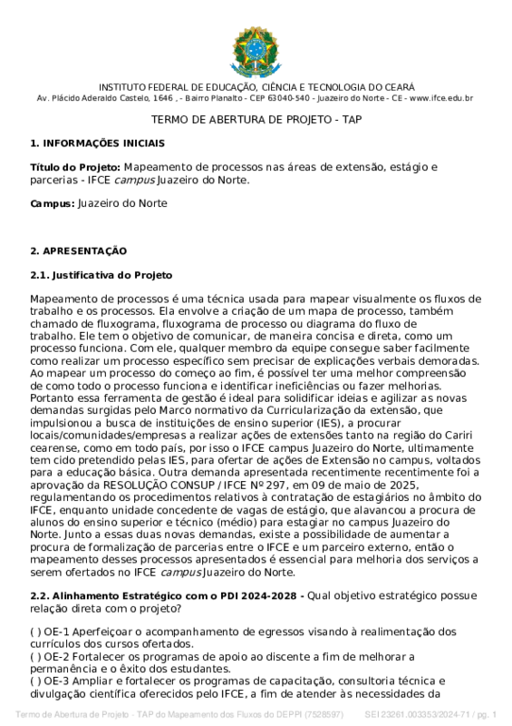 Mapeamento de processos é uma técnica usada para mapear visualmente os fluxos de trabalho e os processos. Ela envolve a criação de um mapa de processo, também chamado de fluxograma, fluxograma de processo ou diagrama do fluxo de trabalho. Ele tem o objetivo de comunicar, de maneira concisa e direta, como um processo funciona. Com ele, qualquer membro da equipe consegue saber facilmente como realizar um processo específico sem precisar de explicações verbais demoradas. Ao mapear um processo do começo ao fim, é possível ter uma melhor compreensão de como todo o processo funciona e identificar ineficiências ou fazer melhorias. Portanto, essa ferramenta de gestão é ideal para solidificar ideias e agilizar as novas demandas surgidas pelo Marco normativo da Curricularização da extensão, que impulsionou a busca de instituições de ensino superior (IES), a procurar locais/comunidades/empresas a realizar ações de extensões tanto na região do Cariri cearense, como em todo país, por isso o IFCE campus Juazeiro do Norte, tem ultimamente sido pretendido pelas IES, para ofertar de ações de Extensão no campus, voltados para a educação básica. Outra demanda apresentada recentemente foi a aprovação da RESOLUÇÃO CONSUP / IFCE Nº 297, em 09 de maio de 2025, regulamentando os procedimentos relativos à contratação de estagiários no âmbito do IFCE, enquanto unidade concedente de vagas de estágio, que alavancou a procura de alunos do ensino superior e técnico (médio) para estagiar no campus Juazeiro do Norte. Junto a essas duas novas demandas, existe a possibilidade de aumentar a procura de formalização de parcerias entre o IFCE e um parceiro externo, então o mapeamento desses processos apresentados é essencial para melhoria dos serviços a serem ofertados no IFCE campus Juazeiro do Norte.