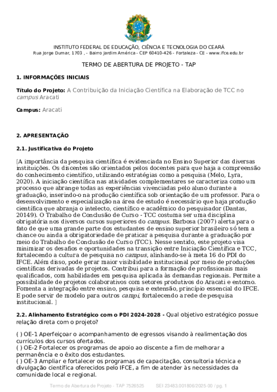 A importância da pesquisa científica é evidenciada no Ensino Superior das diversas instituições. Os discentes são orientados pelos docentes para que haja a compreensão do conhecimento científico, utilizando estratégias como a pesquisa (Melo, Lyra, 2020). A iniciação científica nas atividades complementares se caracteriza como um processo que abrange todas as experiências vivenciadas pelo aluno durante a graduação, inserindo-o na produção científica sob orientação de um professor. Para o desenvolvimento e especialização na área de estudo é necessário que haja produção científica que abranja o intelecto, científico e acadêmico do pesquisador (Dantas, 20149). O Trabalho de Conclusão de Curso - TCC costuma ser uma disciplina obrigatória nos diversos cursos superiores do campus. Barbosa (2007) alerta para o fato de que uma grande parte dos estudantes de ensino superior brasileiro só tem a chance ou ainda a obrigatoriedade de praticar a pesquisa durante a graduação por meio do Trabalho de Conclusão de Curso (TCC). Nesse sentido, este projeto visa minimizar os desafios e oportunidades na transição entre Iniciação Científica e TCC, fortalecendo a cultura de pesquisa no campus, alinhando-se à meta 16 do PDI do IFCE. Além disso, pode gerar maior visibilidade institucional por meio de produções científicas derivadas de projetos. Contribui para a formação de profissionais mais qualificados, com habilidades em pesquisa aplicada às demandas regionais. Permite a possibilidade de projetos colaborativos com setores produtivos do Aracati e entorno. Fomenta a integração entre ensino, pesquisa e extensão, princípio essencial do IFCE. E pode servir de modelo para outros campi, fortalecendo a rede de pesquisa institucional.