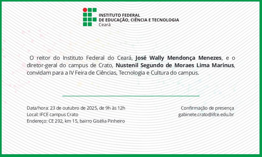 Contudo, é de extrema importância a realização da IV FEIRA DE CIÊNCIAS, TECNOLOGIA E CULTURA para o trabalho de consolidação no sentido de possibilitar não só o envolvimento e a interação entre docentes e discentes do cursos técnicos integrados ao ensino médio, do IFCE Campus Crato bem como permitir o diálogo interinstitucional e oportunizar a toda comunidade acadêmica.