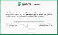 Dessa forma, o evento em questão destaca-se como um espaço de incentivo à produção científica, tecnológica e cultural e buscará discutir resultados de projetos inovadores e originais oriundos das áreas exclusivas da: Base Nacional Comum Curricular, BNCC e da Base Técnica, distribuídos em quatro cursos da educação profissional técnica de nível médio integrado ao ensino médio: agropecuária, agroindústria, informática e lazer do IFCE Campus Crato, por meio da divulgação científica, além de incentivar a capacidade de reflexão, estimular a criatividade dos estudantes e preparação para o mercado de trabalho situados no município de Crato-CE.