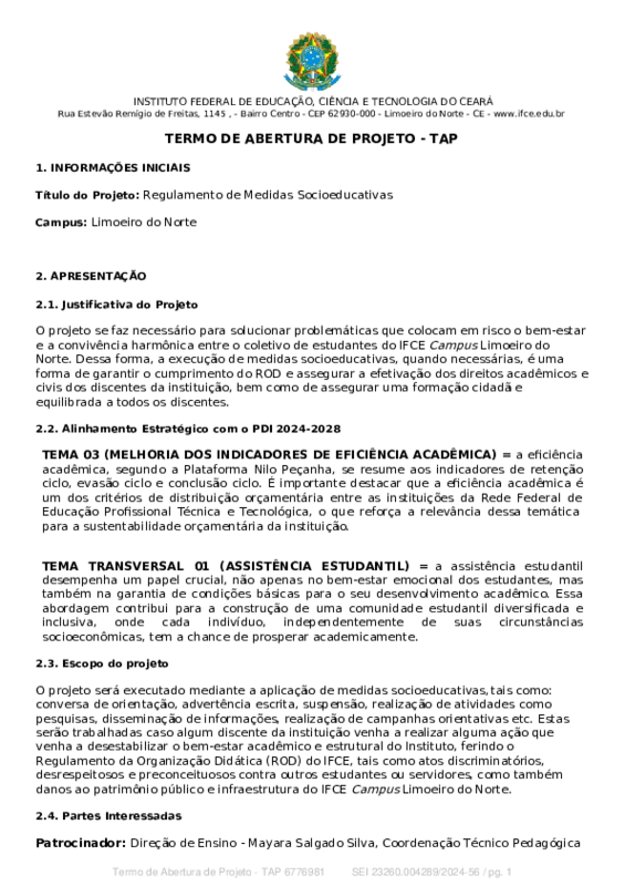O projeto se faz necessário para solucionar problemáticas que colocam em risco o bem-estar e a convivência harmônica entre o coletivo de estudantes do IFCE Campus Limoeiro do Norte. Dessa forma, a execução de medidas socioeducativas, quando necessárias, é uma forma de garantir o cumprimento do ROD e assegurar a efetivação dos direitos acadêmicos e civis dos discentes da instituição, bem como de assegurar uma formação cidadã e equilibrada a todos os discentes.