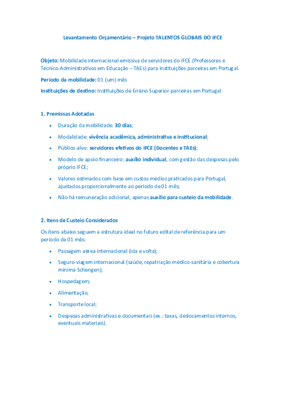 Esta seção apresenta o levantamento orçamentário preliminar do Projeto Talentos Globais do IFCE, desenvolvido no âmbito das ações de internacionalização institucional, com foco na mobilidade internacional emissiva de servidores do IFCE — docentes e técnico-administrativos em educação (TAEs) — para instituições de ensino superior parceiras em Portugal, com duração prevista de 01 (um) mês.