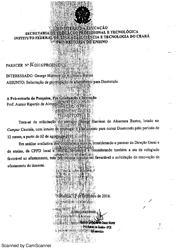 Solicitação de prorrogação de afastamento para Doutorado do servidor George Harrison de Alcantara Bastos - Campus Caucaia.
