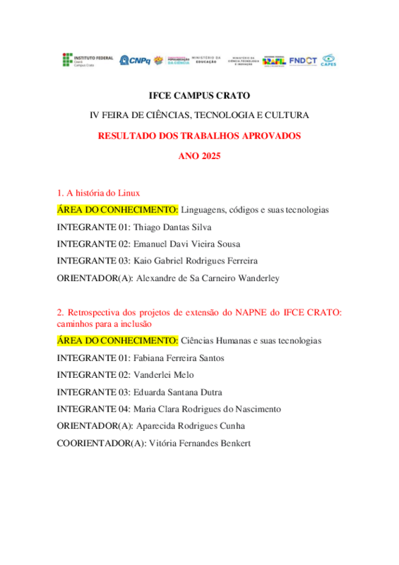 ● Apresentação na IV Feira de Ciências, Tecnologia e Cultura do IFCE campus Crato: 23 de