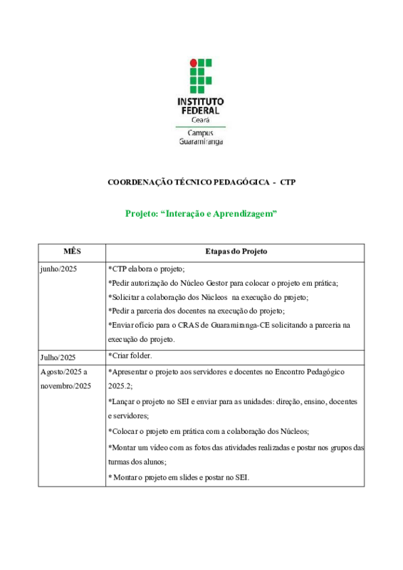 As etapas do projeto: "Interação e Aprendizagem" será executada pela CTP e Núcleos e terá durante de seis meses.