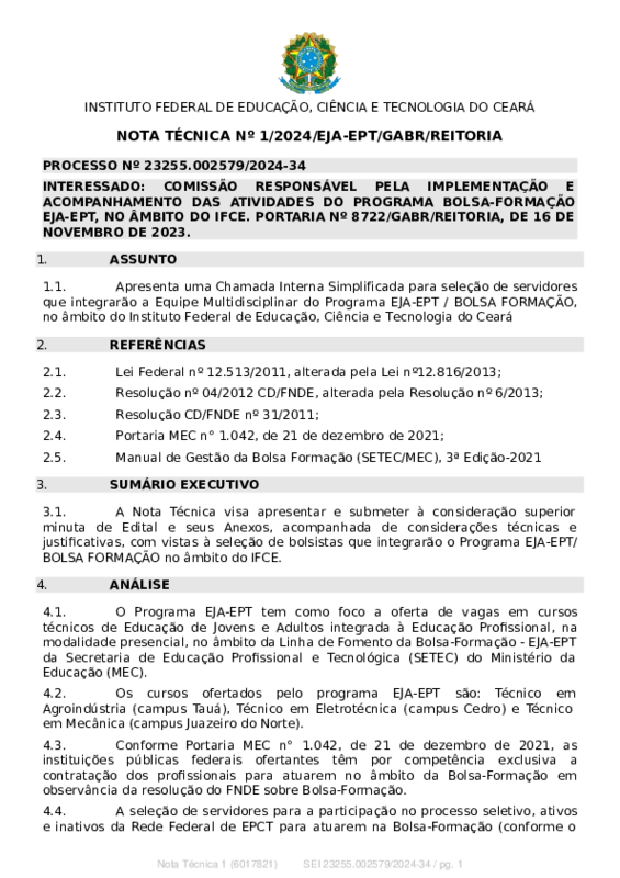 Elaboração de NOTA TÉCNICA Nº 1/2024/EJA-EPT/GABR/REITORIA que Apresenta uma Chamada Interna Simplificada para seleção de servidores que integrarão a Equipe Multidisciplinar do Programa EJA-EPT / BOLSA FORMAÇÃO,