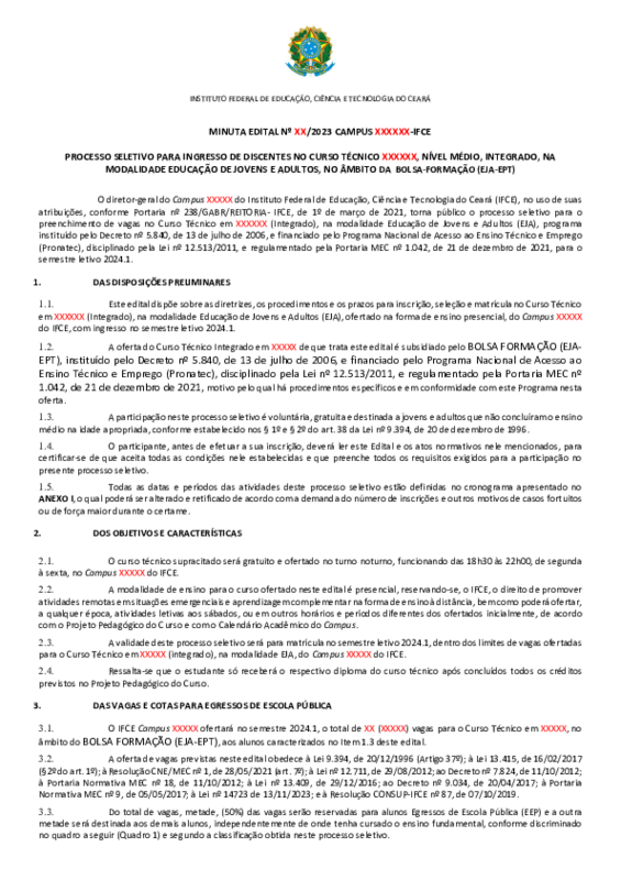 Elaboração de minuta de edital de processo seletivo para ingresso de discentes dos cursos técnicos integrados na modalidade de EJA, no âmbito da Bolsa-Formação.