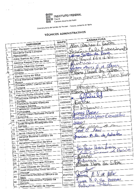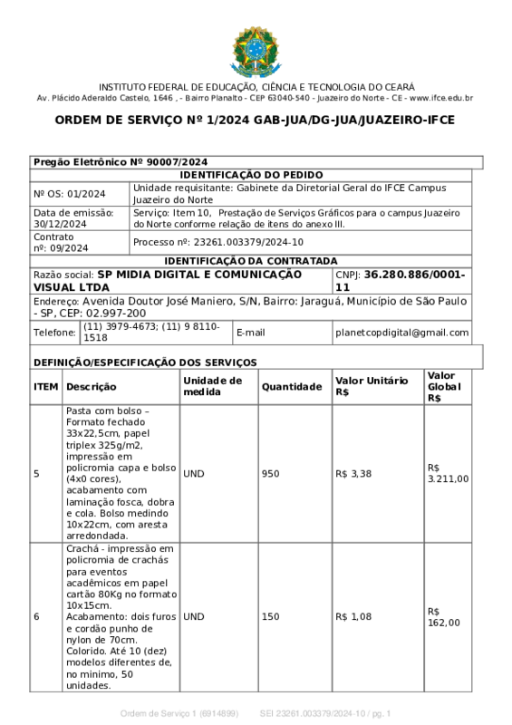 A aquisição dos materiais gráficos iniciou-se ainda no exercício 2024, com a abertura do Pregão nº 900007/2024 (gerenciado pelo IFCE campus Crateús), a formalização do Contrato nº 09/2024 pelo Campus Juazeiro do Norte e a emissão da Ordem de Serviço 1 (SEI 6914899). Os materiais foram recebidos em 2025 e entregues aos servidores ao longo do ano, conforme listas de recebimento anexas.