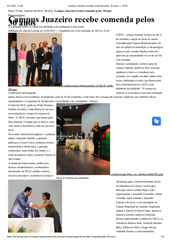 A solenidade de abertura da comemoração dos 30 anos do Campus Juazeiro do Norte aconteceu no dia 11 de setembro de 2025, dia do aniversário do Campus, e foi marcada por emoção e orgulho pelo reconhecimento da nossa instituição, diante à comunidade, pelo serviço de educação de qualidade que vem sendo prestado no Cariri, ao longo dos seus 30 anos de existência. Durante a solenidade, o campus recebeu uma comenda da Câmara de Vereadores de Juazeiro do Norte, isto é, uma condecoração pelo destaque da instituição em sua área de atuação.