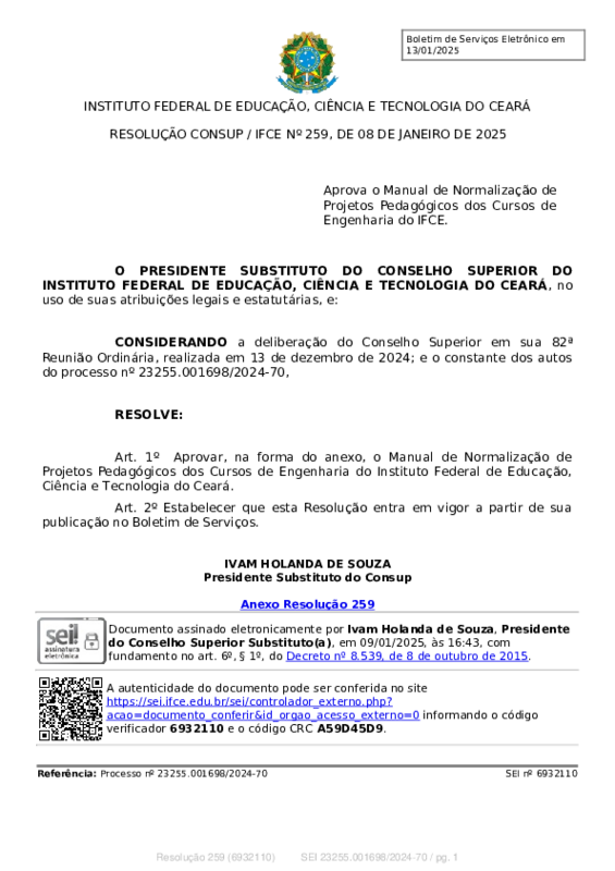 AbertaRESOLUÇÃO CONSUP / IFCE Nº 259, DE 08 DE JANEIRO DE 2025