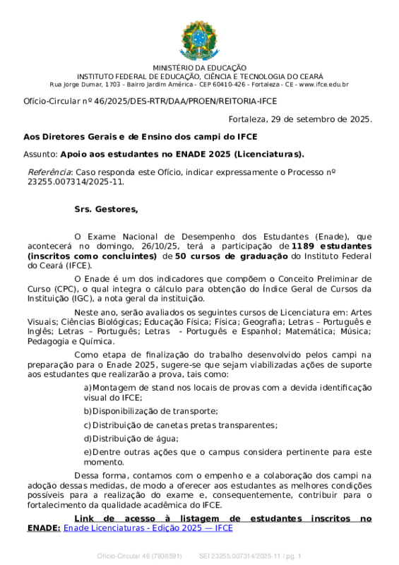 AbertaOfício-Circular nº 46/2025/DES-RTR/DAA/PROEN/REITORIA-IFCE - Apoio aos estudantes no ENADE 2025 (Licenciaturas)
