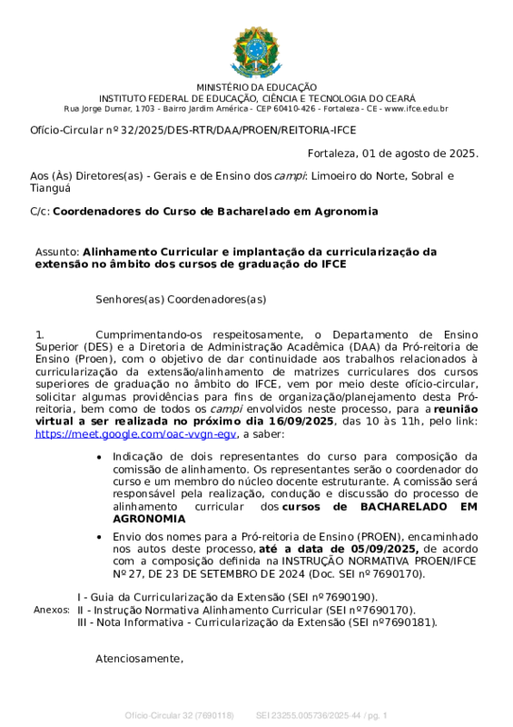 AbertaOfício-Circular nº 32/2025/DES-RTR/DAA/PROEN/REITORIA-IFCE - Alinhamento Curricular e implantação da curricularização da extensão no âmbito dos cursos de graduação do IFCE