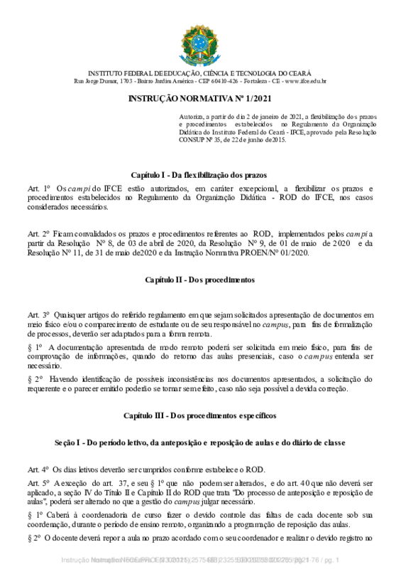 AbertaINSTRUÇÃO NORMATIVA Nº 1/2021 Autoriza a flexibilização dos prazos e procedimentos estabelecidos no Regulamento da Organização Didática do Instituto Federal do Ceará - IFCE