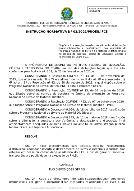AbertaINSTRUÇÃO NORMATIVA Nº 03/2021/PROEN/IFCE, dispõe sobre seleção, escolha, recebimento, distribuição, acompanhamento e desfazimento dos materiais do Programa Nacional do Livro e do Material Didático (PNLD)