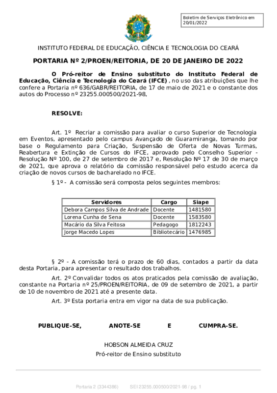 AbertaPORTARIA Nº 2/PROEN/REITORIA, DE 20 DE JANEIRO DE 2022