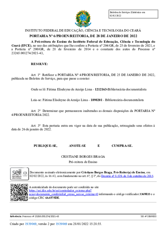 Retificar a PORTARIA Nº 4/PROEN/REITORIA, DE 25 DE JANEIRO DE 2022,