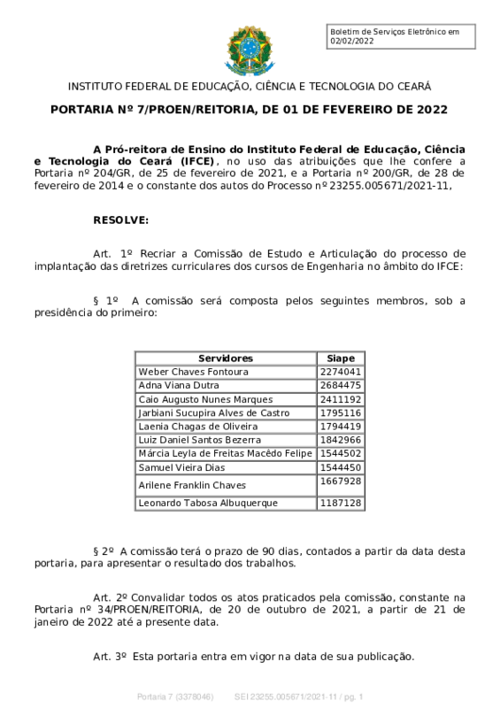 AbertaPORTARIA Nº 7/PROEN/REITORIA, DE 01 DE FEVEREIRO DE 2022