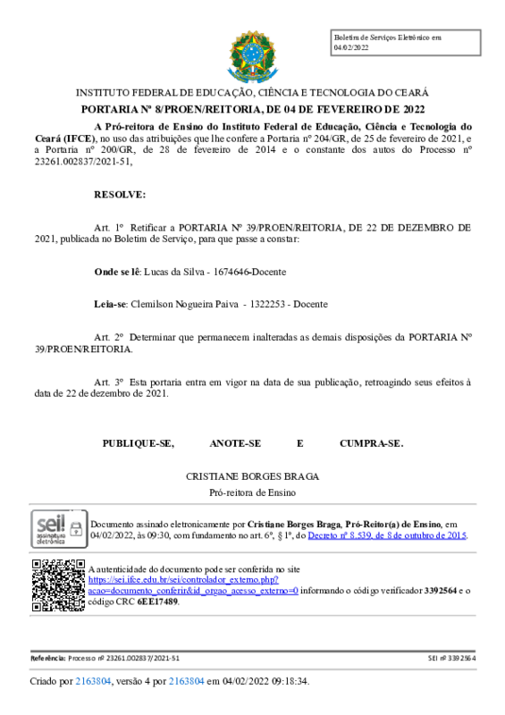 AbertaPORTARIA Nº 8/PROEN/REITORIA, DE 04 DE FEVEREIRO DE 2022