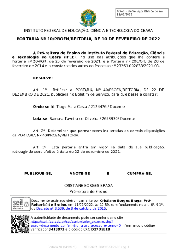 AbertaPORTARIA Nº 10/PROEN/REITORIA, DE 10 DE FEVEREIRO DE 2022