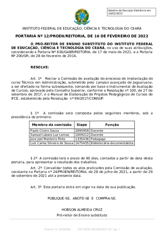AbertaPORTARIA Nº 12/PROEN/REITORIA, DE 16 DE FEVEREIRO DE 2022