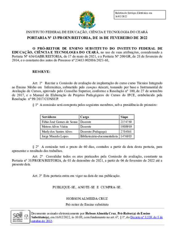 AbertaPORTARIA Nº 13/PROEN/REITORIA, DE 16 DE FEVEREIRO DE 2022