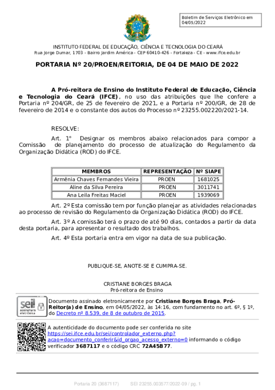 AbertaPORTARIA Nº 20/PROEN/REITORIA, DE 04 DE MAIO DE 2022