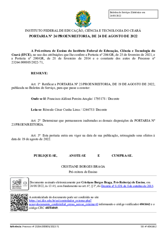 Art. 1º Retificar a PORTARIA Nº 23/PROEN/REITORIA, DE 19 DE AGOSTO DE 2022,