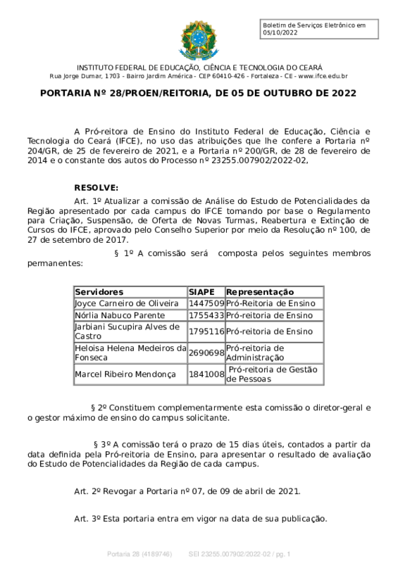 AbertaPORTARIA Nº 28/PROEN/REITORIA, DE 05 DE OUTUBRO DE 2022
