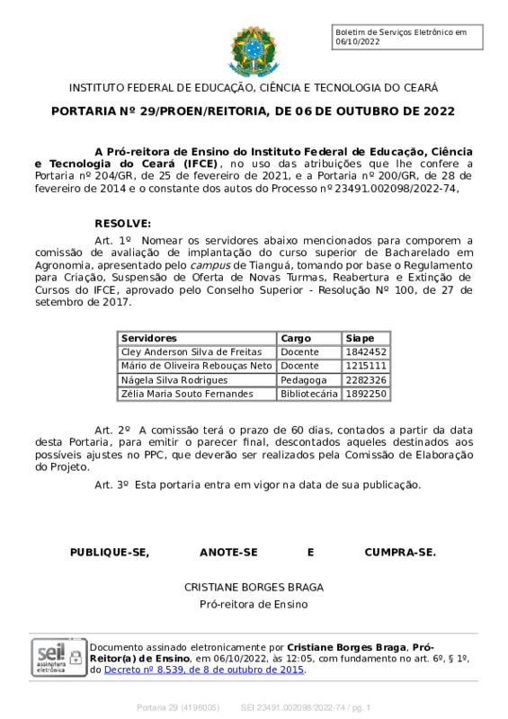 AbertaPORTARIA Nº 29/PROEN/REITORIA, DE 06 DE OUTUBRO DE 2022