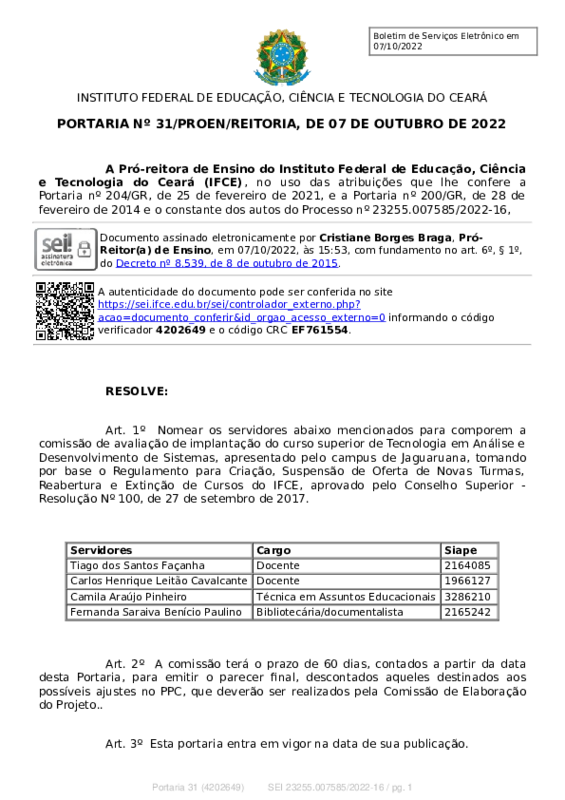comissão de avaliação de implantação do curso superior de Tecnologia em Análise e