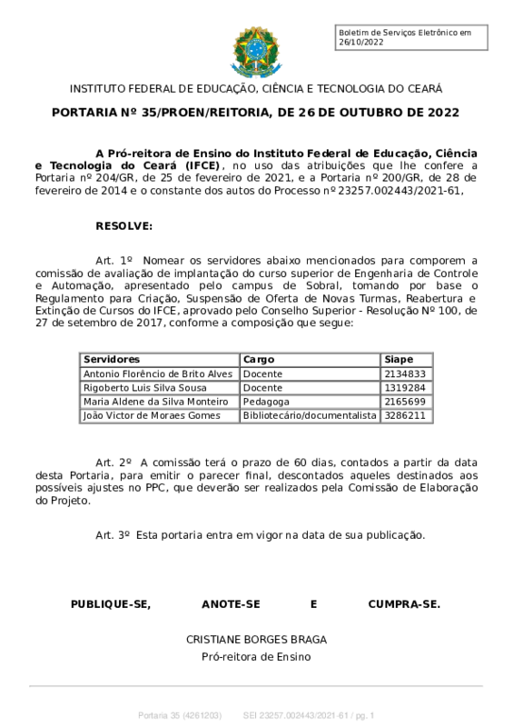 AbertaPORTARIA Nº 35/PROEN/REITORIA, DE 26 DE OUTUBRO DE 2022