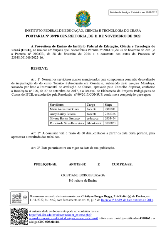AbertaPORTARIA Nº 38/PROEN/REITORIA, DE 11 DE NOVEMBRO DE 2022