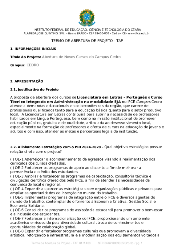 A proposta de abertura dos cursos de Licenciatura em Letras – Português e Curso Técnico Integrado em Administração na modalidade EJA no IFCE Campus Cedro atende a demandas educacionais e socioeconômicas da região, que carece de profissionais qualificados tanto para a educação básica quanto para o setor produtivo local. A Licenciatura em Letras contribuirá para suprir a necessidade de professores habilitados em Língua Portuguesa, bem como na missão institucional de promover educação pública, gratuita e de qualidade, articulada ao desenvolvimento local, especialmente na formação de professores e oferta de cursos na educação de jovens e adultos e com isso, atender as metas e percentuais legais da instituição.