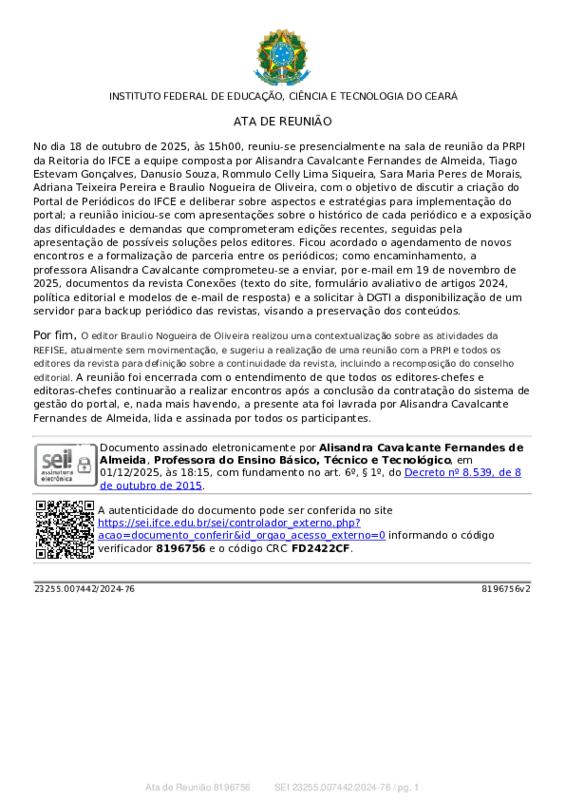 No dia 18 de outubro de 2025, às 15h00, reuniu‑se presencialmente na sala de reunião da PRPI da Reitoria do IFCE a equipe composta por: