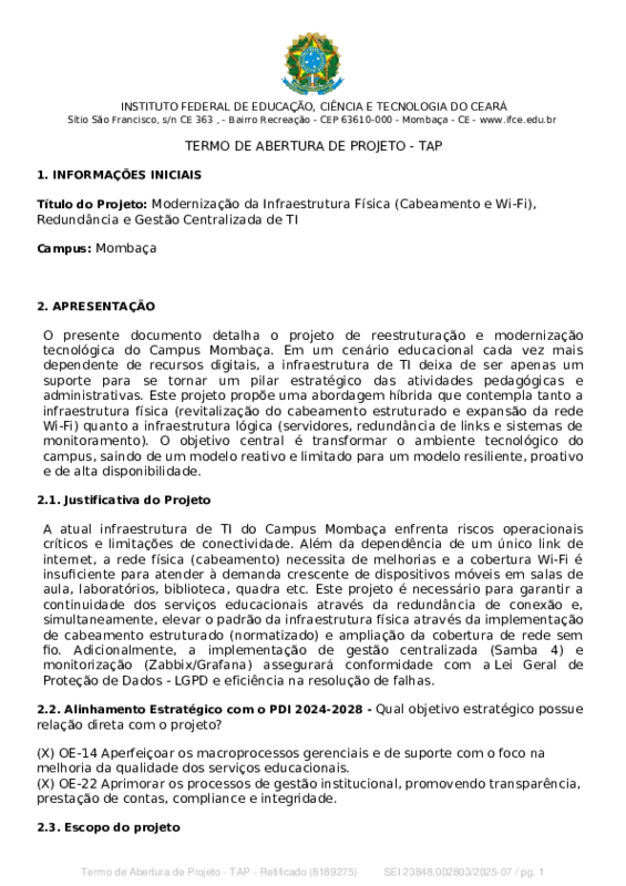 A atual infraestrutura de TI do Campus Mombaça enfrenta riscos operacionais críticos e limitações de conectividade. Além da dependência de um único link de internet, a rede física (cabeamento) necessita de melhorias e a cobertura Wi-Fi é insuficiente para atender à demanda crescente de dispositivos móveis em salas de aula, laboratórios, biblioteca, quadra etc. Este projeto é necessário para garantir a continuidade dos serviços educacionais através da redundância de conexão e, simultaneamente, elevar o padrão da infraestrutura física através da implementação de cabeamento estruturado (normatizado) e ampliação da cobertura de rede sem fio. Adicionalmente, a implementação de gestão centralizada (Samba 4) e monitorização (Zabbix/Grafana) assegurará conformidade com a Lei Geral de Proteção de Dados - LGPD e eficiência na resolução de falhas.