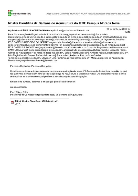 A VII Semana de Aquicultura do IFCE Campus Morada Nova, através da Comissão Organizadora, designada pela Portaria Nº 5914/GAB-MOR/DG-MOR/MORADA, DE 12 DE JUNHO DE 2025, tem o objetivo, por meio deste edital, de proporcionar a exposição de trabalhos científicos abrangendo os segmentos e temas debatidos no evento.