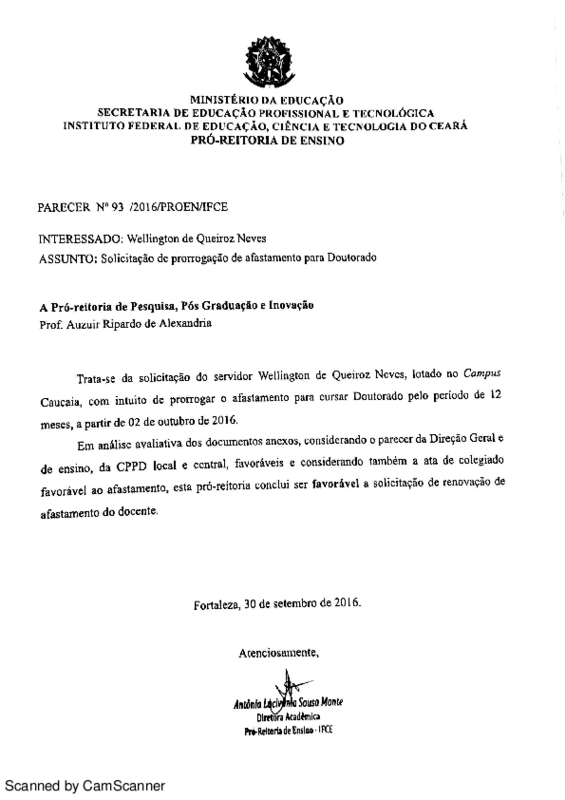 Solicitação de prorrogação de afastamento para Doutorado do servidor Wellington de Queiróz Neves - Campus Caucaia.