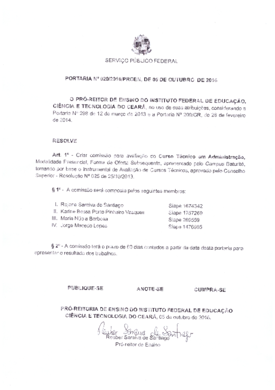 Art. 1º - Criar comissão para avaliação do Curso Técnico em Administração, Modalidade Presencial, Forma de Oferta Subsequente, apresentado pelo Campus Baturité, tomando por base o Instrumental de Avaliação de Cursos Técnicos, aprovado pelo Conselho Superior - Resolução Nº 025 de 25/10/2013.