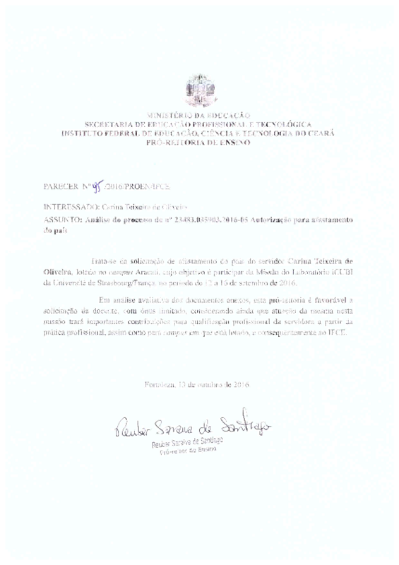 Análise do Processo 23483.035903.2016-05 - solicitação de aafstamento do País da servidora Carina Teixeira de Oliveira - Campus Aracati.