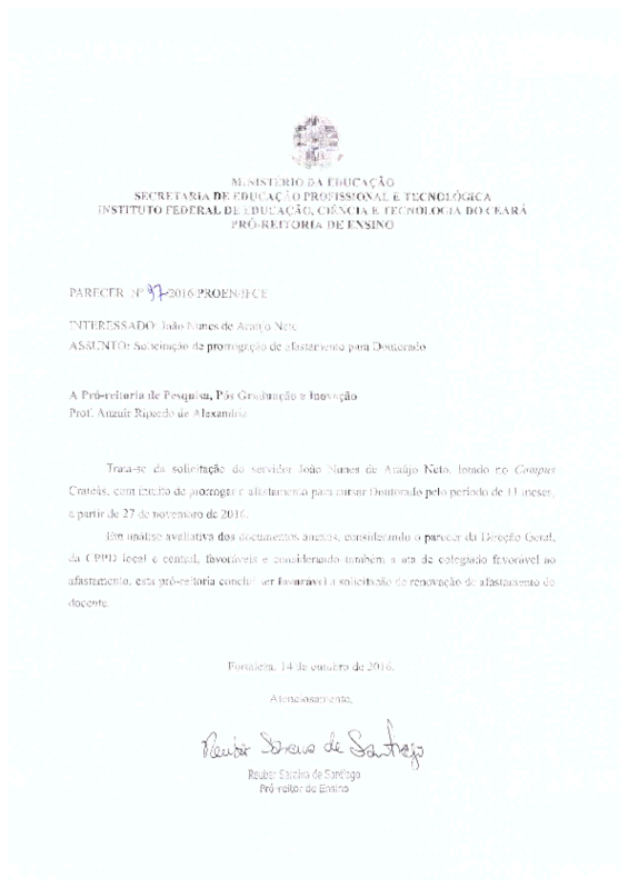Solicitação de prorrogação de afastamento para Doutorado do servidor João Nunes de Araújo Neto - Campus Crateús.
