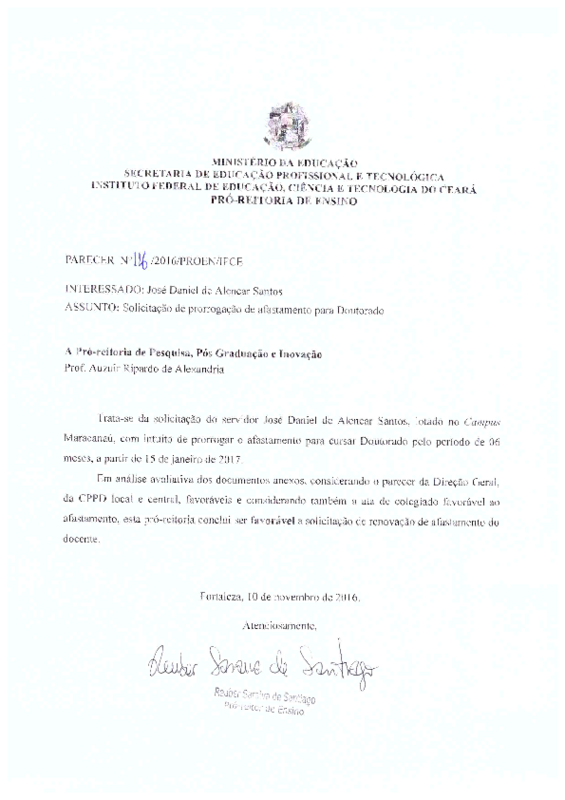 Solicitação de prorrogação de Doutorado do servidor José Daniel de Alencar Santos- Campus Maracanaú.